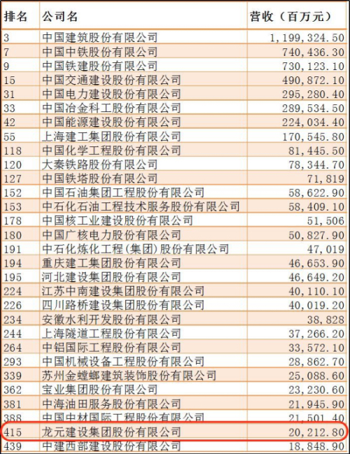 Longyuan Group ranked 415 in Fortune China's Top 500 in 2009 with 20.212 billion yuan in revenue. Two other local construction companies, Shanghai Construction Industry Group Co., Ltd. and Shanghai Tunnel Engineering Co., Ltd., ranked 244.