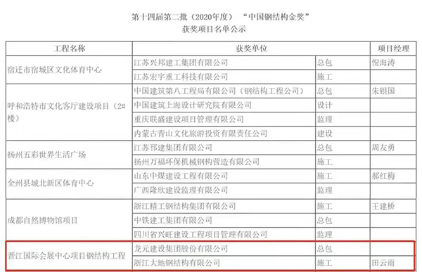 In April 2021, China Building Metal Structure Association announced the list of the second batch of the 14th (2020) China steel structure Gold Award projects. The steel structure project of Jinjiang International Convention and Exhibition Center, the first exhibition PPP project in China and the first PPP project won by Longyuan Group, won the second batch of the 14th "China steel structure Gold Award".