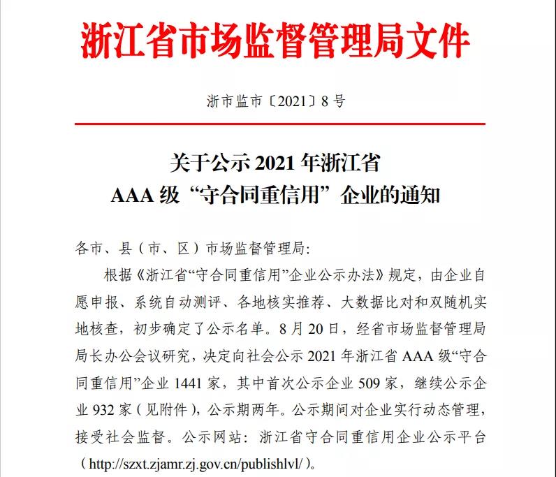 Recently, Zhejiang market supervision bureau announced 1141 enterprises to the public as AAA "contract abiding and trustworthy" enterprises in Zhejiang Province in 2021, including 509 enterprises for the first time and 932 enterprises for further publicity. Longyuan Group continues to be rated as a provincial AAA "contract abiding and credit abiding" enterprise, which is the result of the group's adherence to contract abiding and credit abiding work and promoting enterprise development in good faith for many years.
