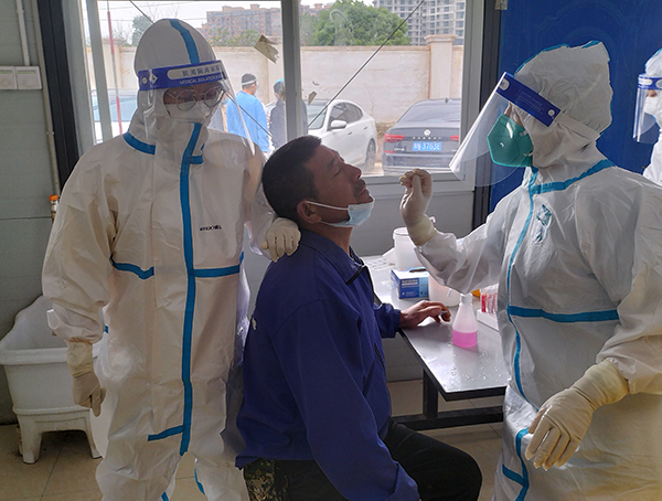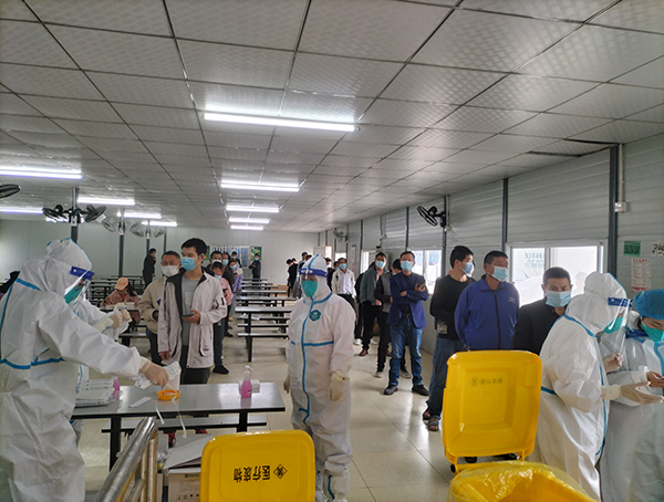 4月28日下午,項目部召集管理人員,召回現場工人,迅速組織開展全員核酸檢測工作。信息核對、樣本采集、樣品分裝等各個環節忙而不亂,急而有序,項目管理人員全部出動,2個半小時配合醫護人員完成項目部全員1220人核酸采樣工作。