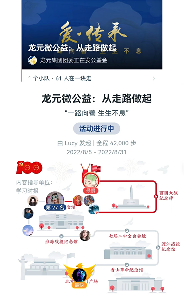 8月5日,集團(tuán)團(tuán)委發(fā)起“龍?jiān)⒐妫簭淖呗烽_(kāi)始”公益捐步活動(dòng),重走紅色旅游地圖。此項(xiàng)活動(dòng)將黨史學(xué)習(xí)教育、互聯(lián)網(wǎng)公益及企業(yè)文化緊密結(jié)合,創(chuàng)新活動(dòng)形式,鼓勵(lì)龍?jiān)獔F(tuán)員青年積極參與。捐步活動(dòng)所產(chǎn)生的所有善款將專項(xiàng)用于“一億顆梭梭樹(shù)”項(xiàng)目,在阿拉善盟地區(qū)種下綠植,為助力“碳中和”貢獻(xiàn)龍?jiān)啻毫α俊?/span>