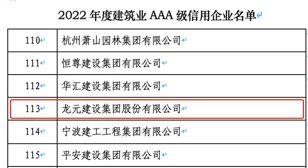 龍元建設(shè)集團(tuán)獲評2022年度建筑業(yè)AAA級信用企業(yè)