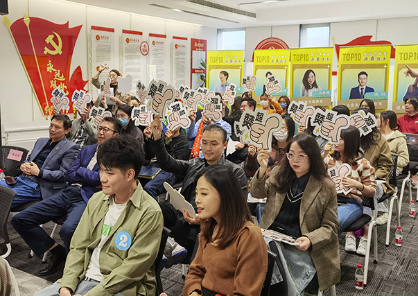 為了讓更多龍?jiān)嗄昴軌騾⑴c到活動(dòng)當(dāng)中,本次「開(kāi)放麥」決賽除了由5位專業(yè)評(píng)審打分外,還面向全集團(tuán)開(kāi)放線上、線下共30個(gè)大眾評(píng)審席位,通過(guò)投票來(lái)對(duì)各位選手進(jìn)行打分。報(bào)名通道開(kāi)啟后,龍?jiān)嗄陚儫崆楦邼q,30個(gè)名額很快一搶而空。決賽當(dāng)天,18名現(xiàn)場(chǎng)大眾評(píng)審和12名線上大眾評(píng)審認(rèn)真聆聽(tīng)每一位選手的演說(shuō),親手選出了受到青年人認(rèn)可的“TALK KING”。